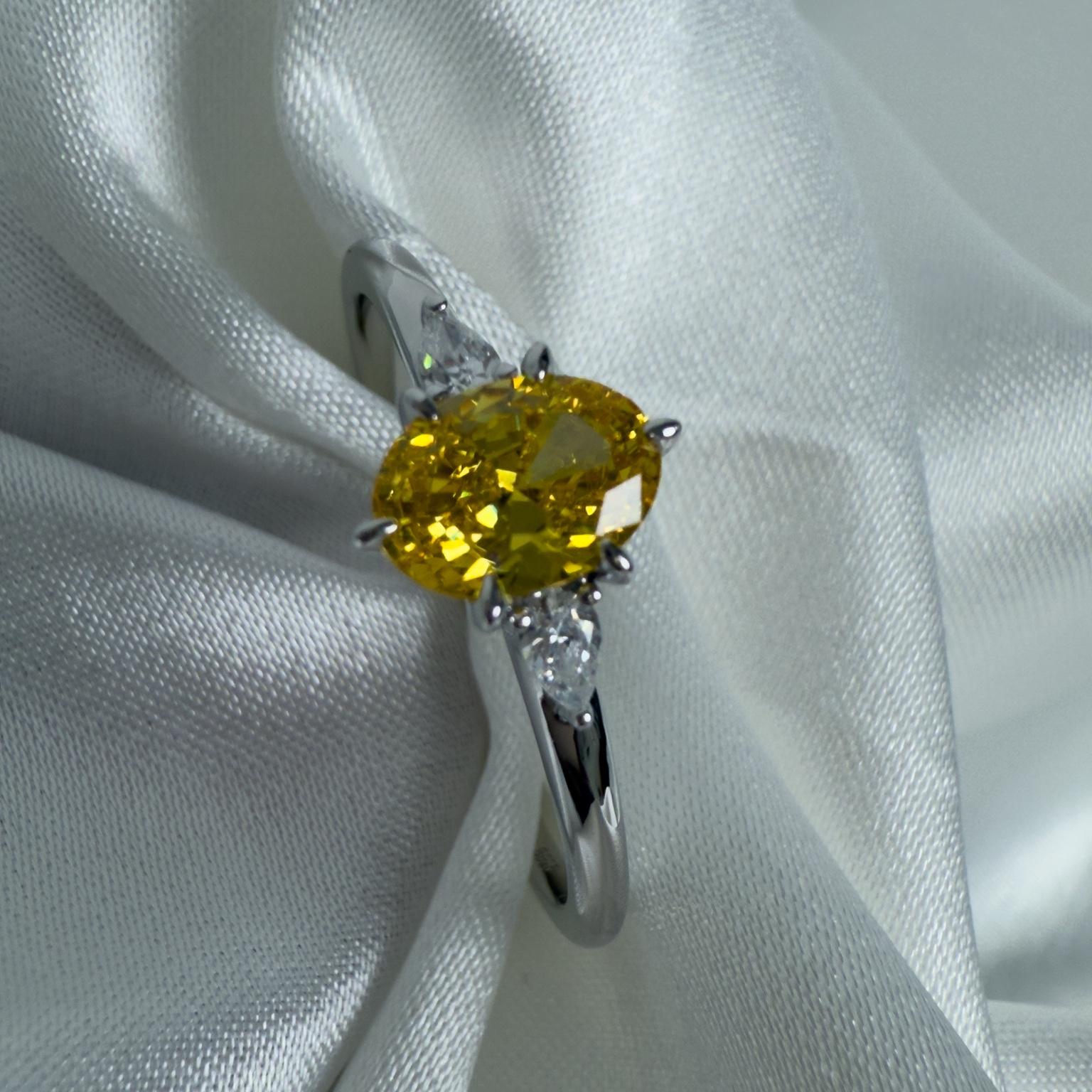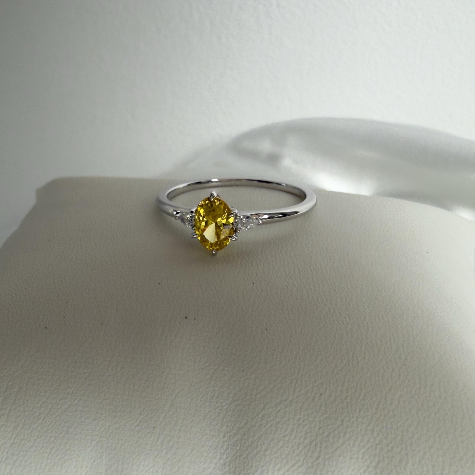 Son zircon jaune taille ovale, accompagné de deux pierres blanches éclatantes, évoque une élégance lumineuse et raffinée, parfaite pour sublimer vos gestes.