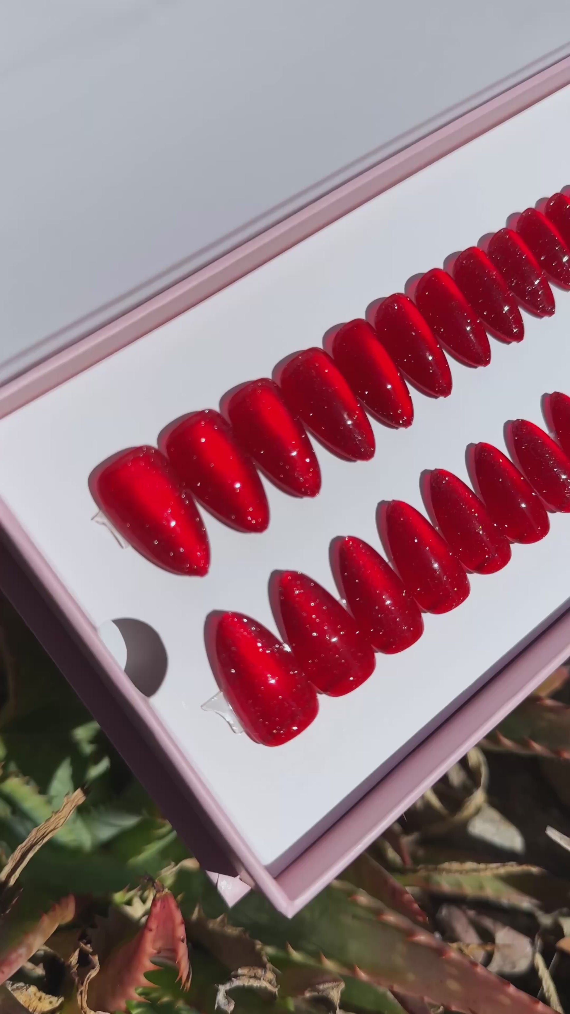 Brillez avec audace grâce à Carmen, un set de press on nails au rouge rubis intense avec œil de chat comme effet, légèrement pailleté, idéal pour les occasions spéciales ou pour affirmer votre style au quotidien.