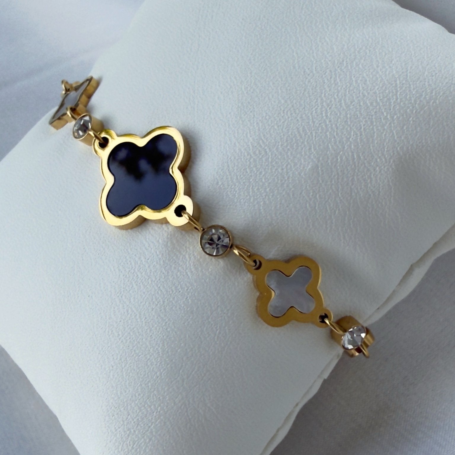 Son design associe des pierres brillantes à des motifs trèfle ajourés et pleins.