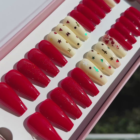 L'esprit des fêtes version manucure: joyeux, doux et scintillant. Les faux ongles holiday Magic sauront vous sublimer. ongles faits main. Taille moyenne, forme ballerine coffin.