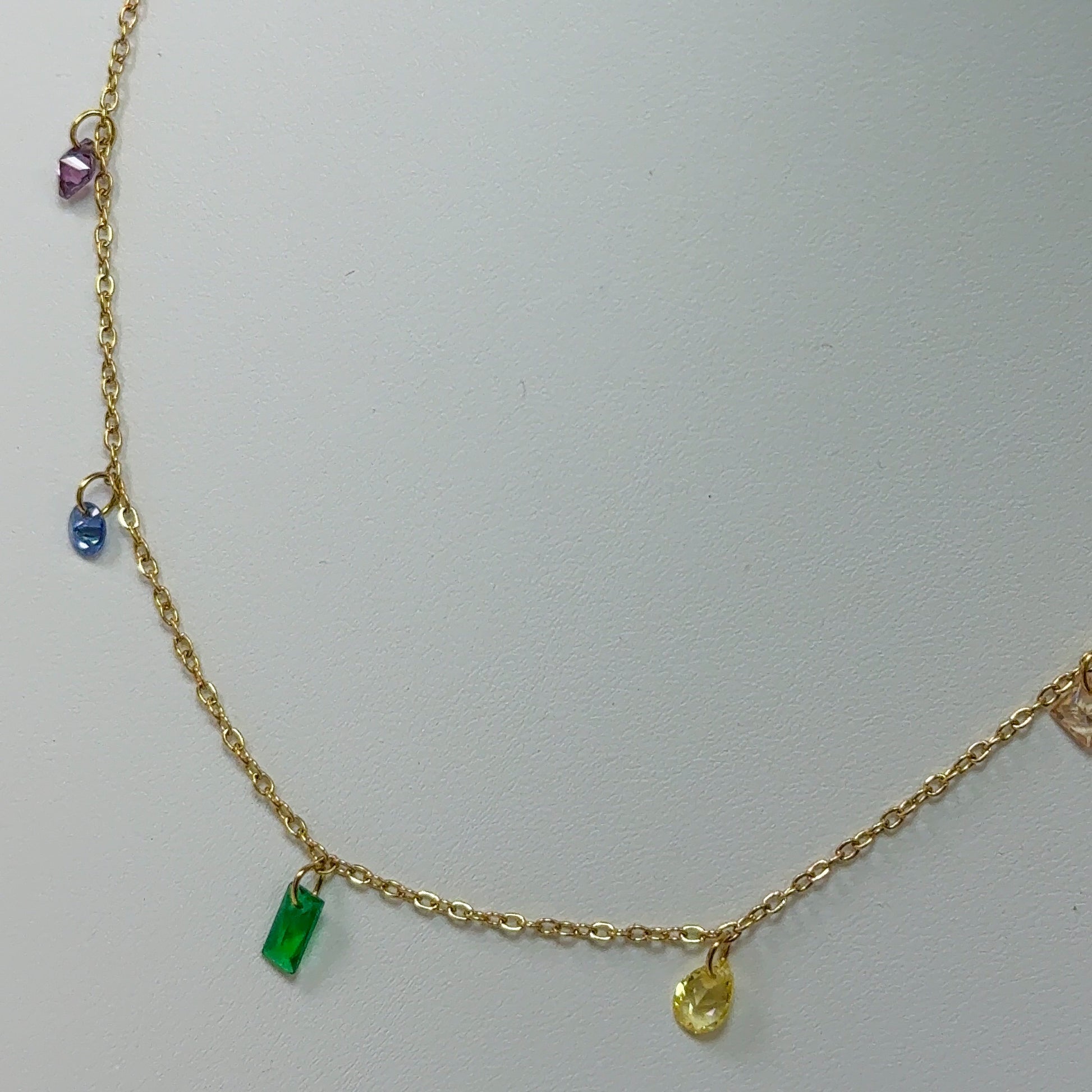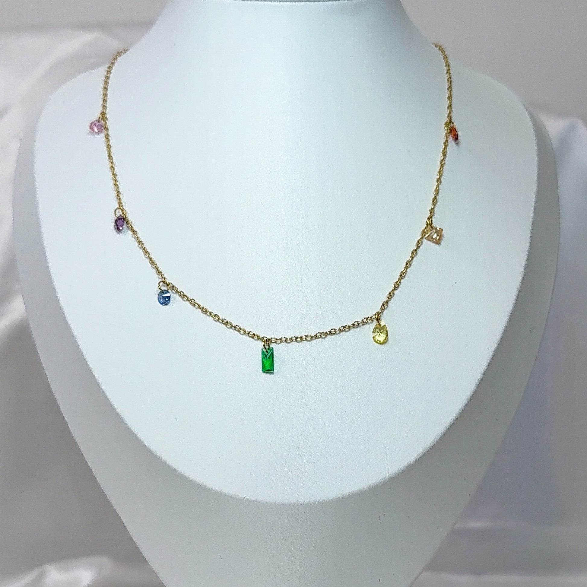 Ajoutez une touche de fantaisie à votre look avec le collier Laurie. Cette pièce légère et joyeuse se compose d’une fine chaîne dorée en acier inoxydable et de petits pendentifs colorés (charms) aux formes et tailles variées : gouttes, cœurs, pierres facettées…