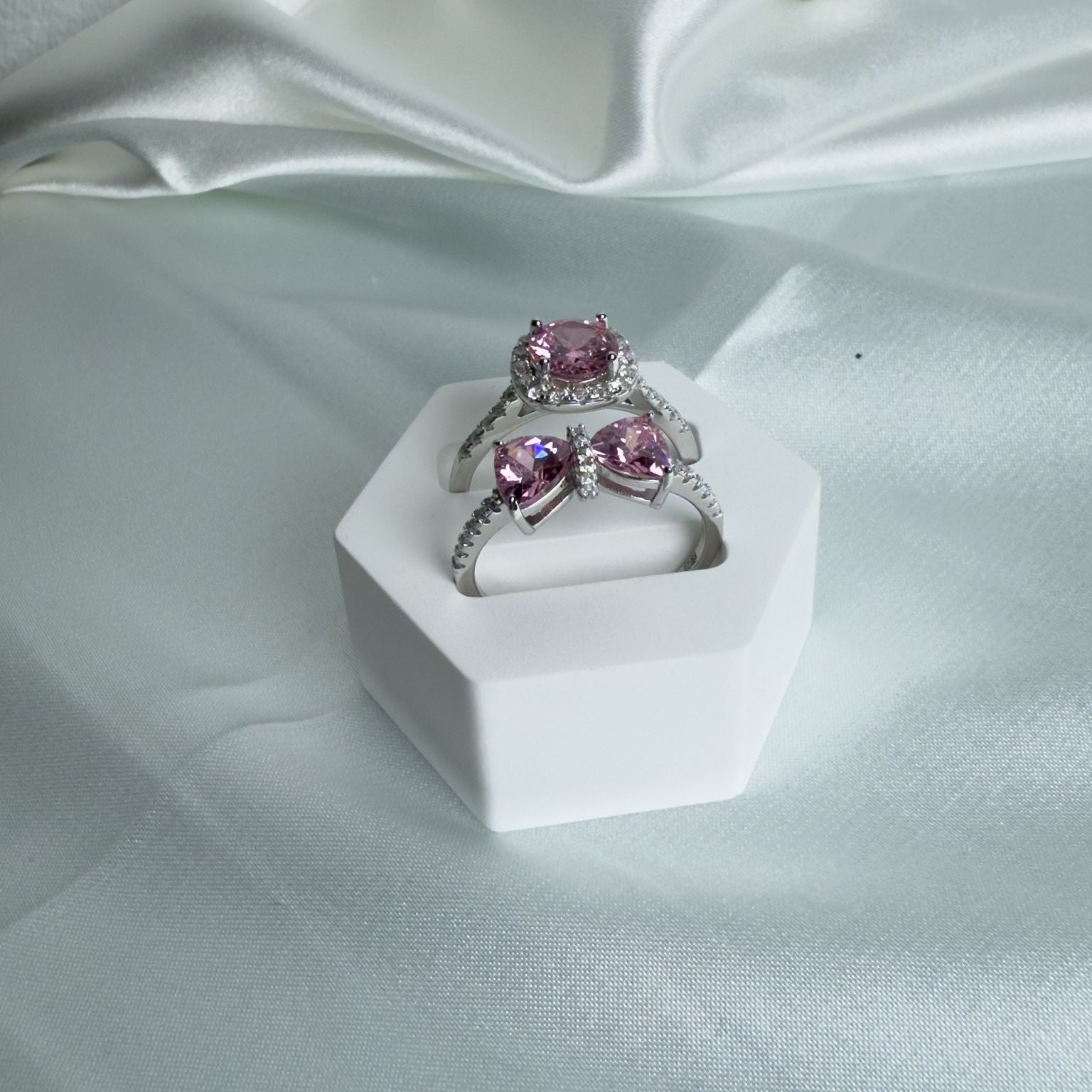 Olivia est une bague raffinée en argent 925 sterling délicatement plaqué en or blanc, ornée d'un nœud formé de deux zircons roses en forme de cœur. finement pavé de petits cristaux scintillants sur l'anneau, cette bague incarne l'élégance romantique et la féminité.