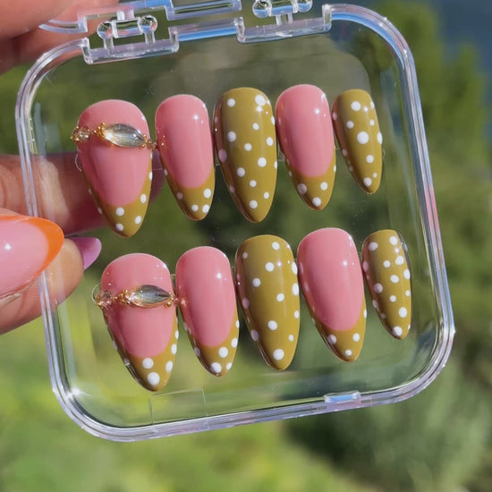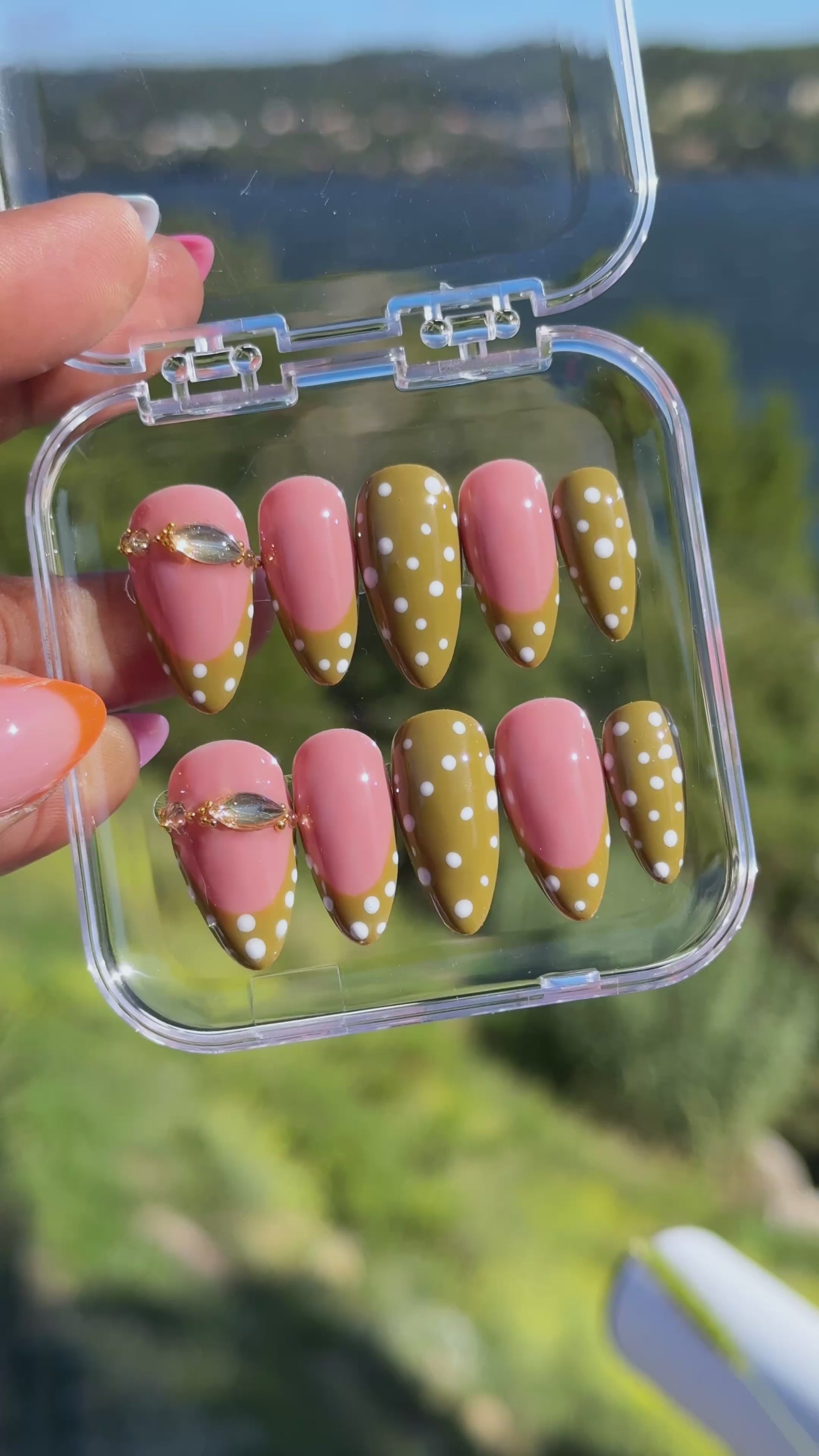 L'esprit vintage et espiègle de l'automne: original, fun, plein de caractère, es press on nails " Rétro Olive" sauront apporter du charme à vos doigts.
