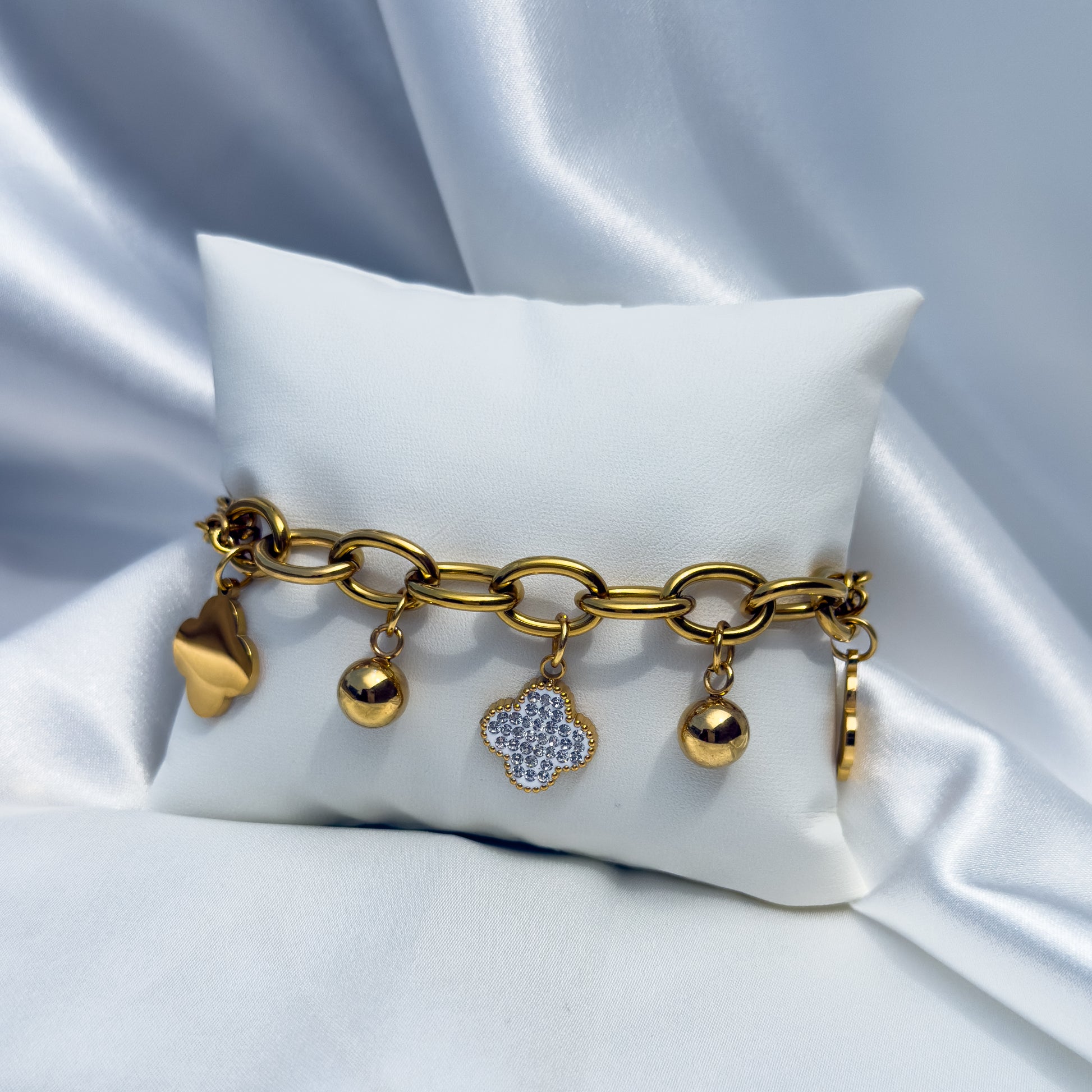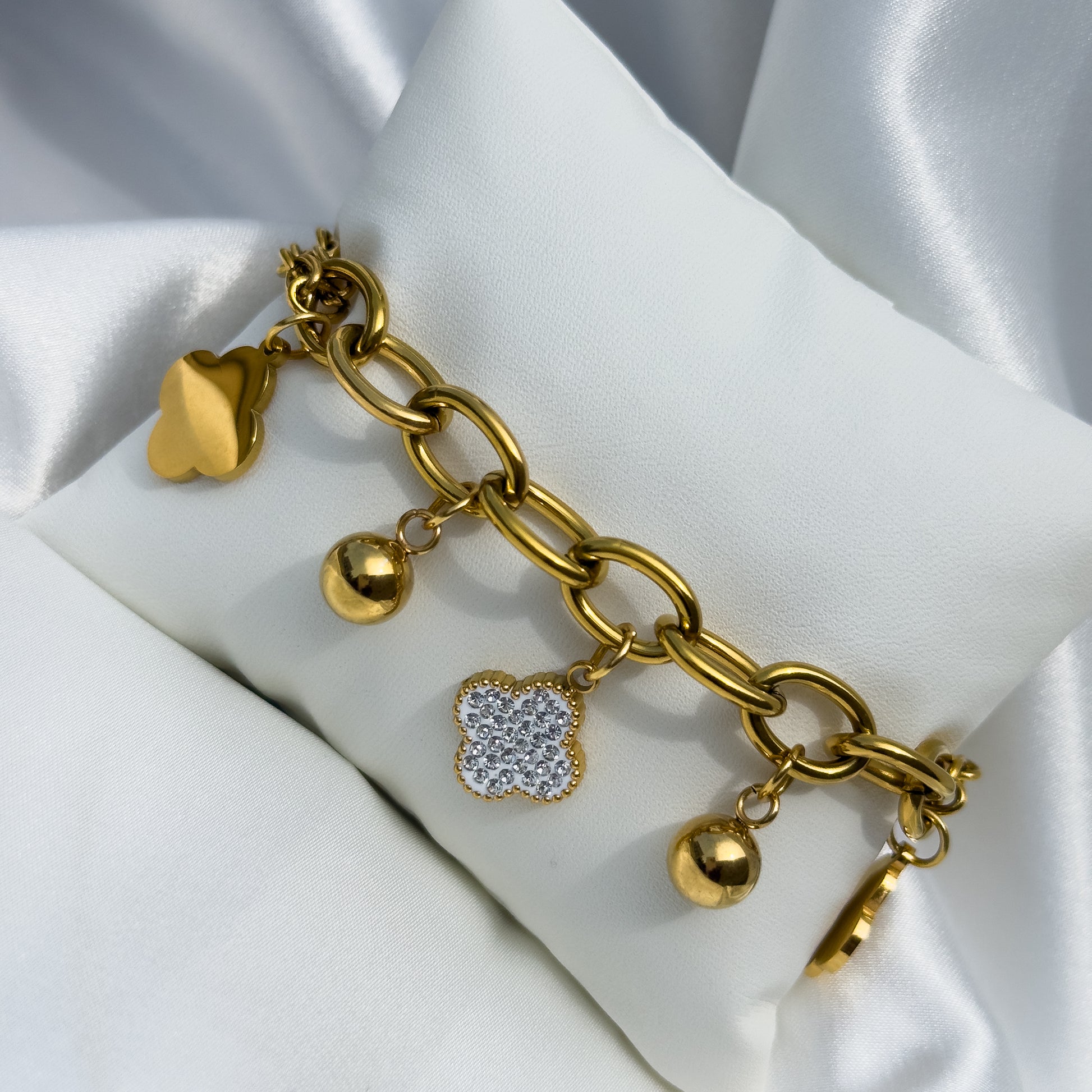 Le bracelet Sofia est est une pièce audacieuse et féminine qui allie charme et caractère. Confectionné en acier inoxydable et plaqué or 18 carats, ce bracelet chic est orné de pampilles dorées et d'un trèfle central pavé de zircons éclatants.