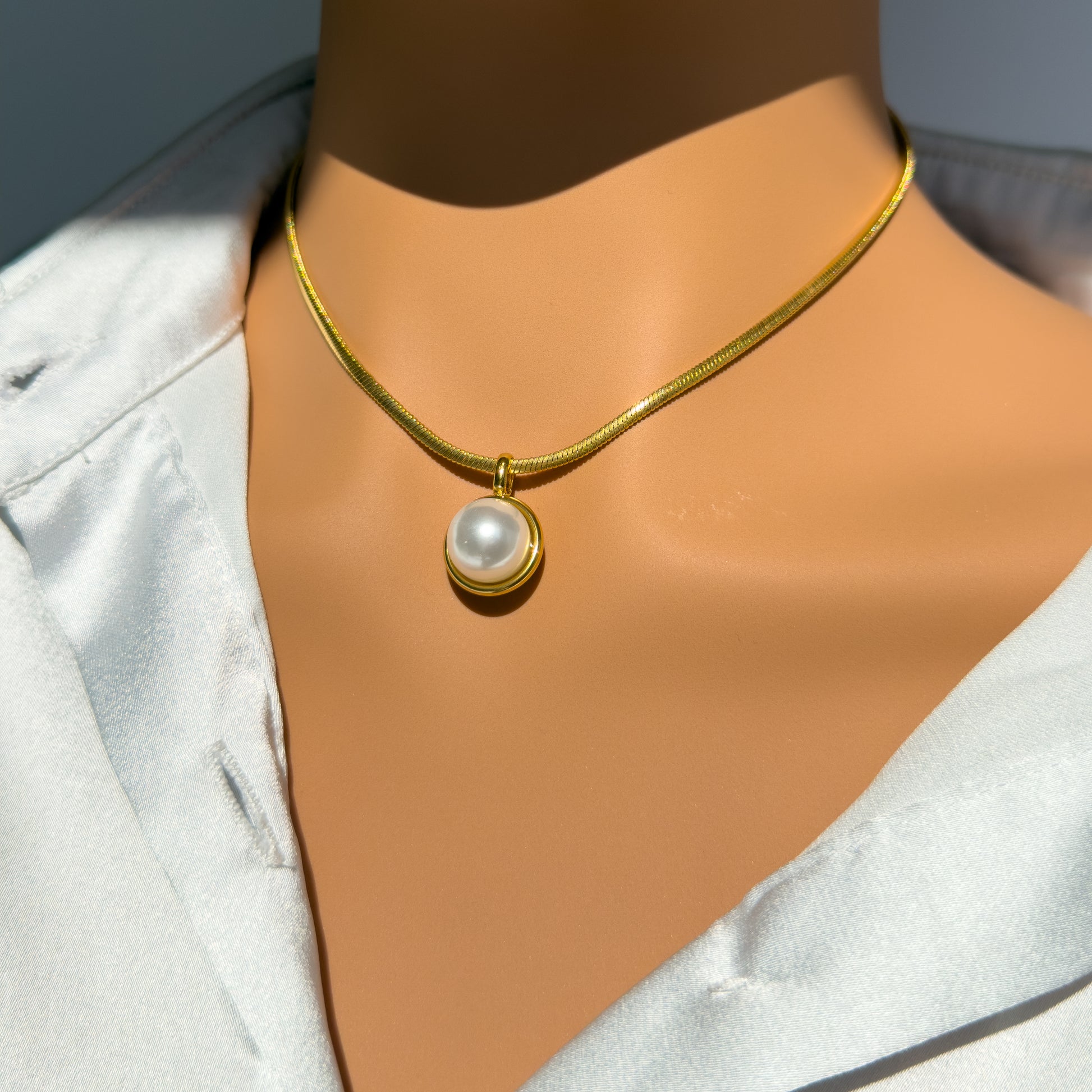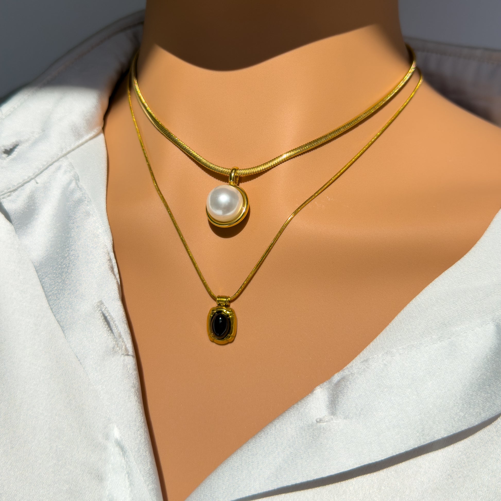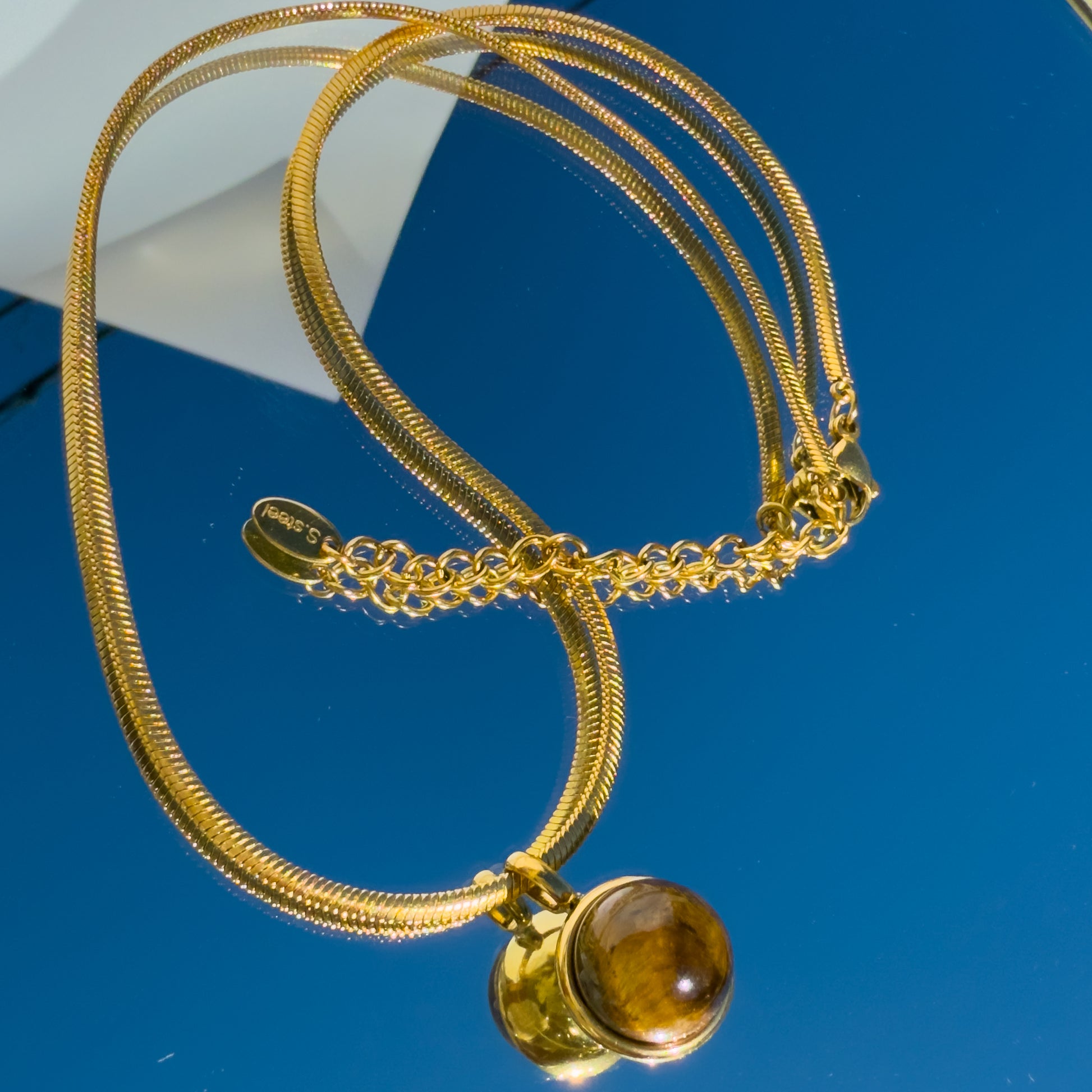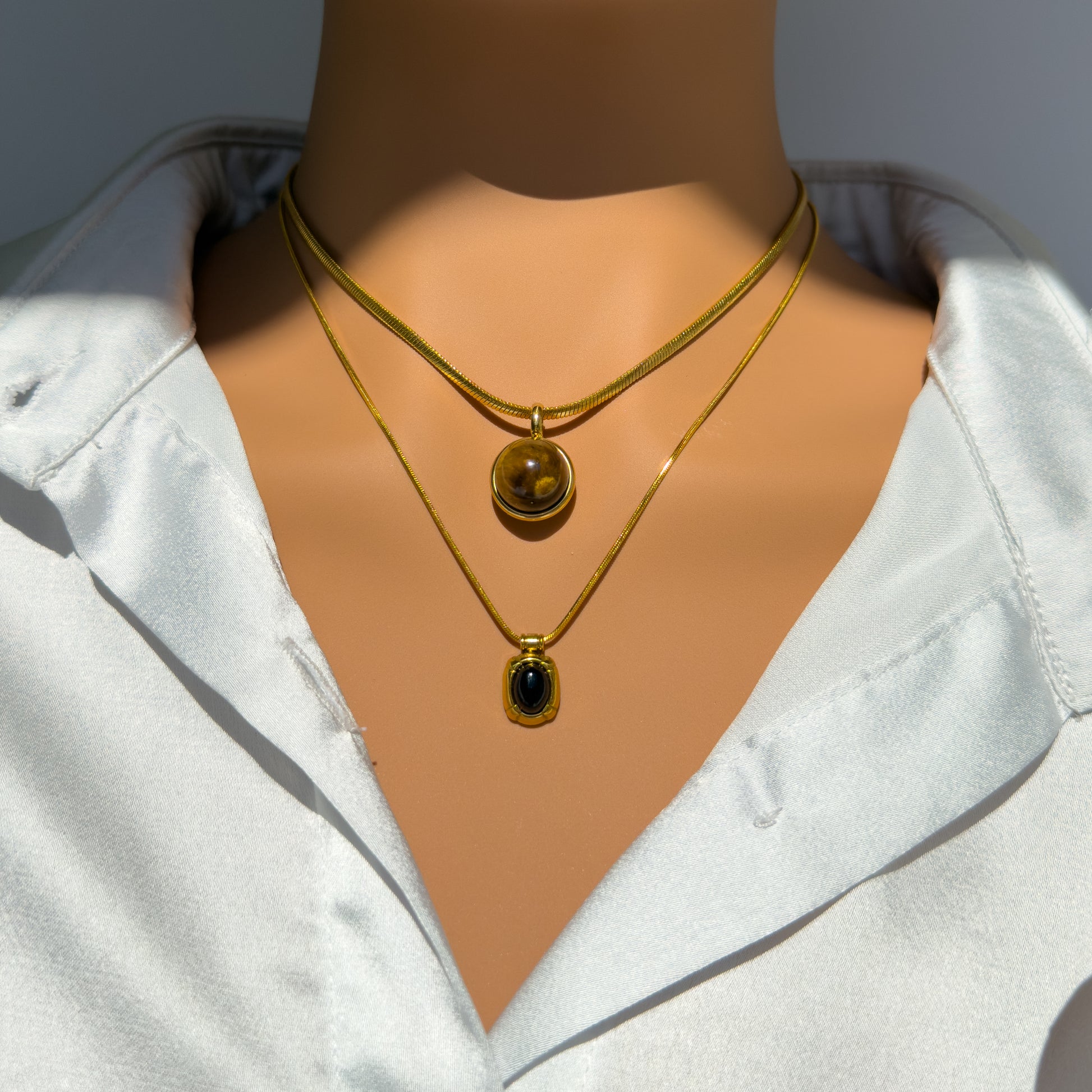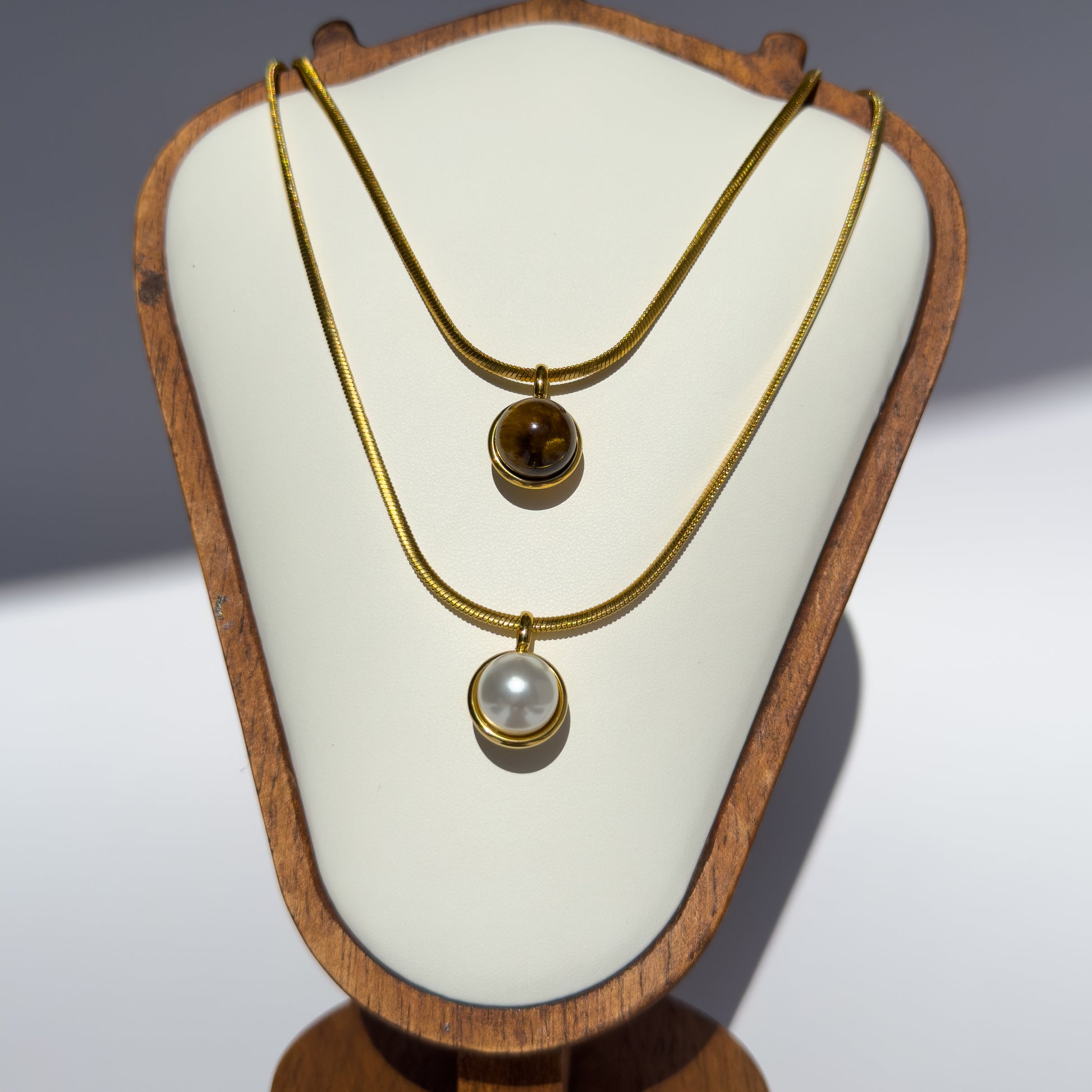 - Pendentif : laiton doré + perle synthétique ou pierre naturelle (œil de tigre)