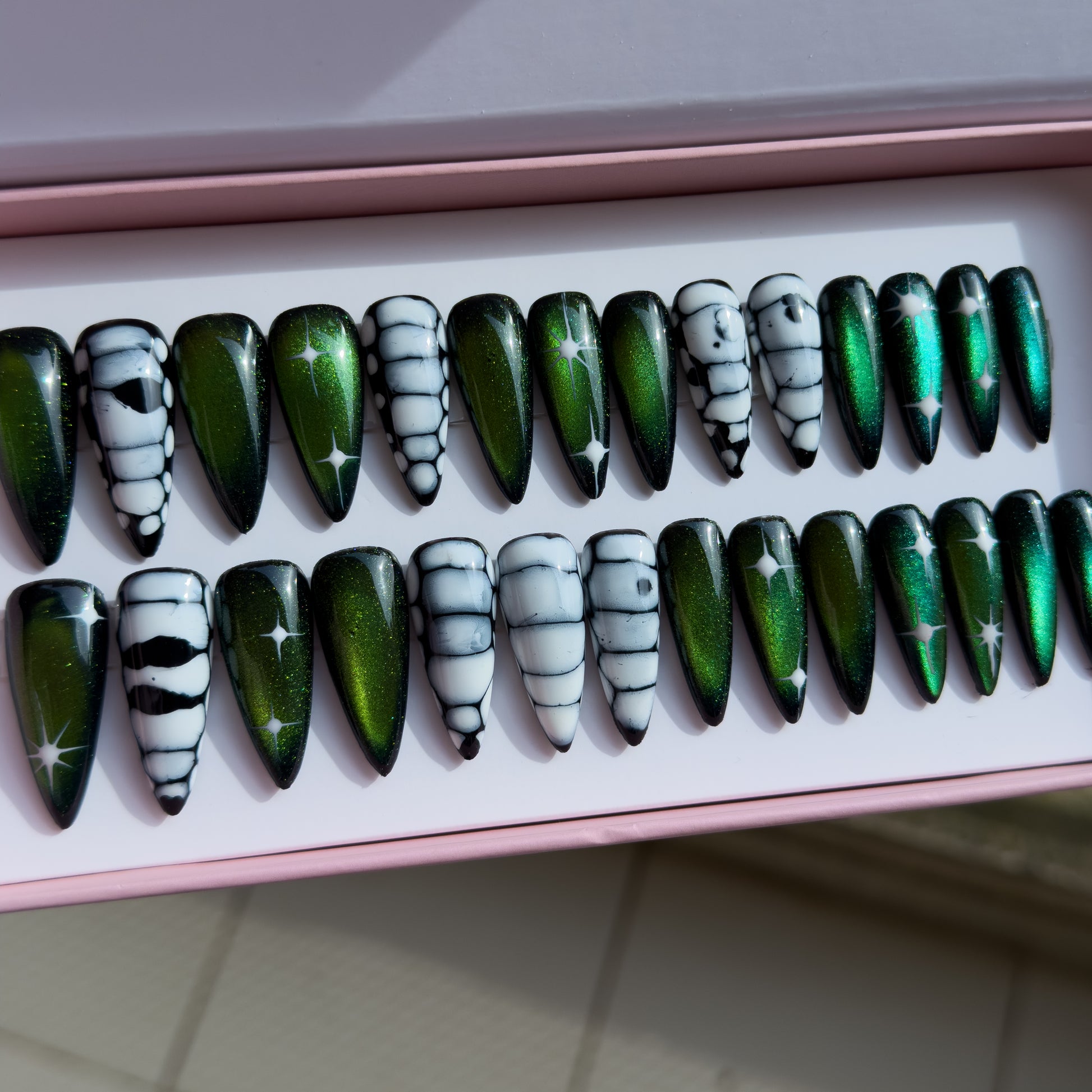 Winter Spruce, un set de 28 faux ongles prêt à l'envoi. Forme stiletto, taille M